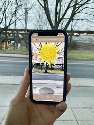 Durch Scannen des Codes sieht der Betrachter das 3D-Modell des Sonnensystems von Nikolaus Kopernikus, das sich in der Luft dreht.
