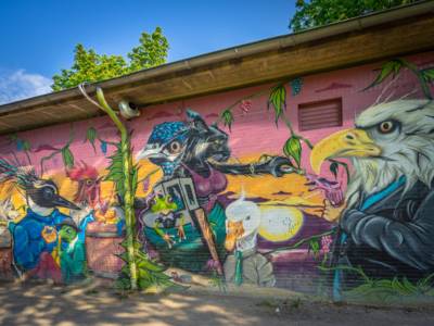 Am Küchengarten 11A hat der Graffiti Künstler Linus Müller mit seinen farbenfrohen Arbeiten die Fassade gestaltet.