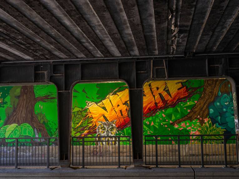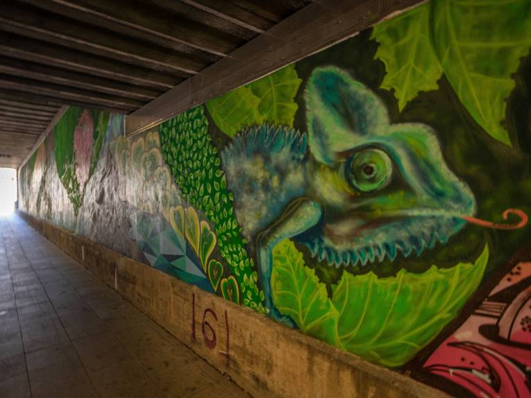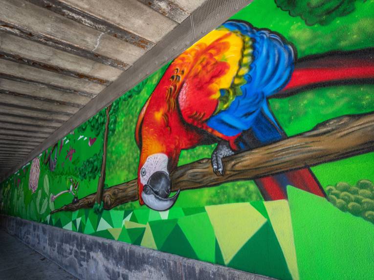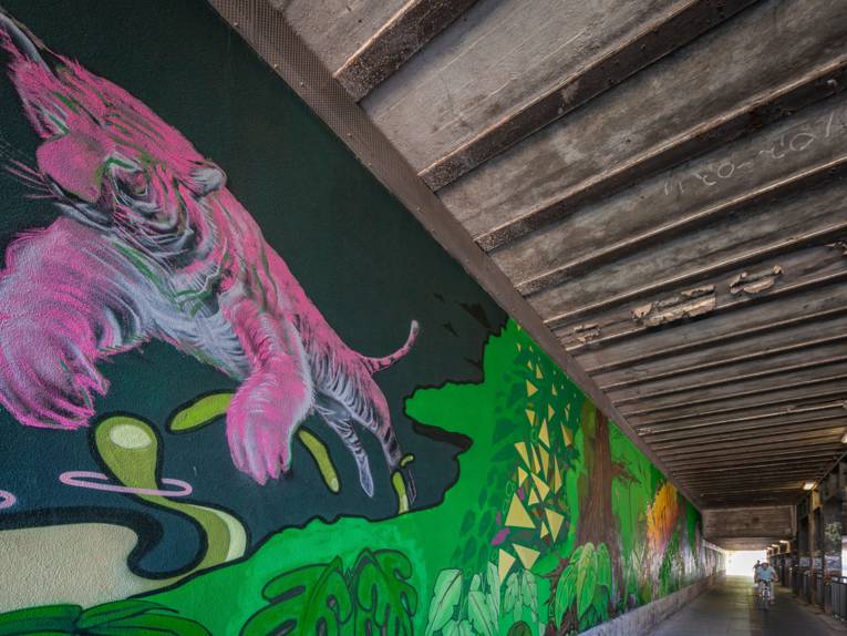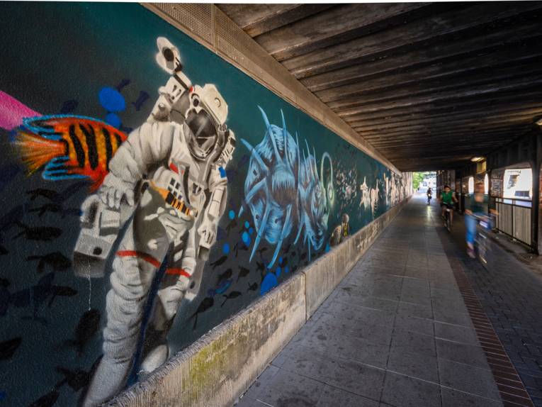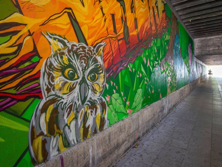 Zwei Dutzend Jugendliche um Jascha Müller und Jonas Wömpner vom Graffiti Netzwerk haben innerhalb von sechs Wochen beide Straßenseiten der dunklen Unterführung tierisch bunt aufgewertet.