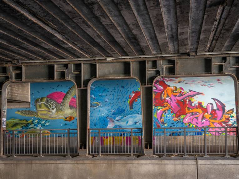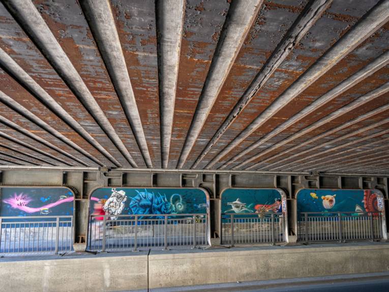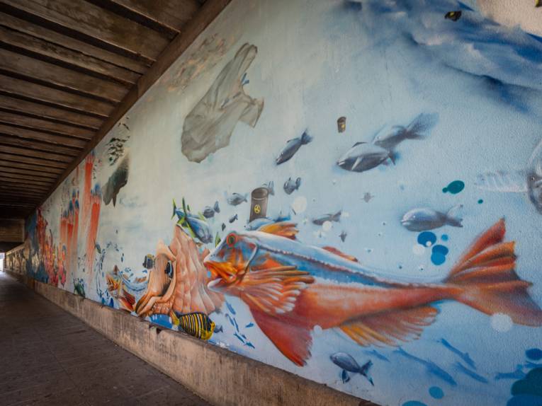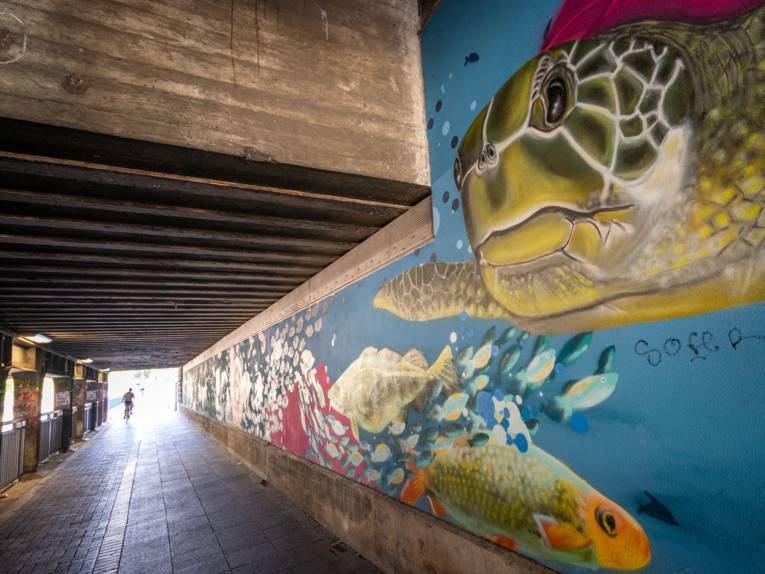 Bunte Unterwasser- und Tierwelt in der dunklen Unterführung.