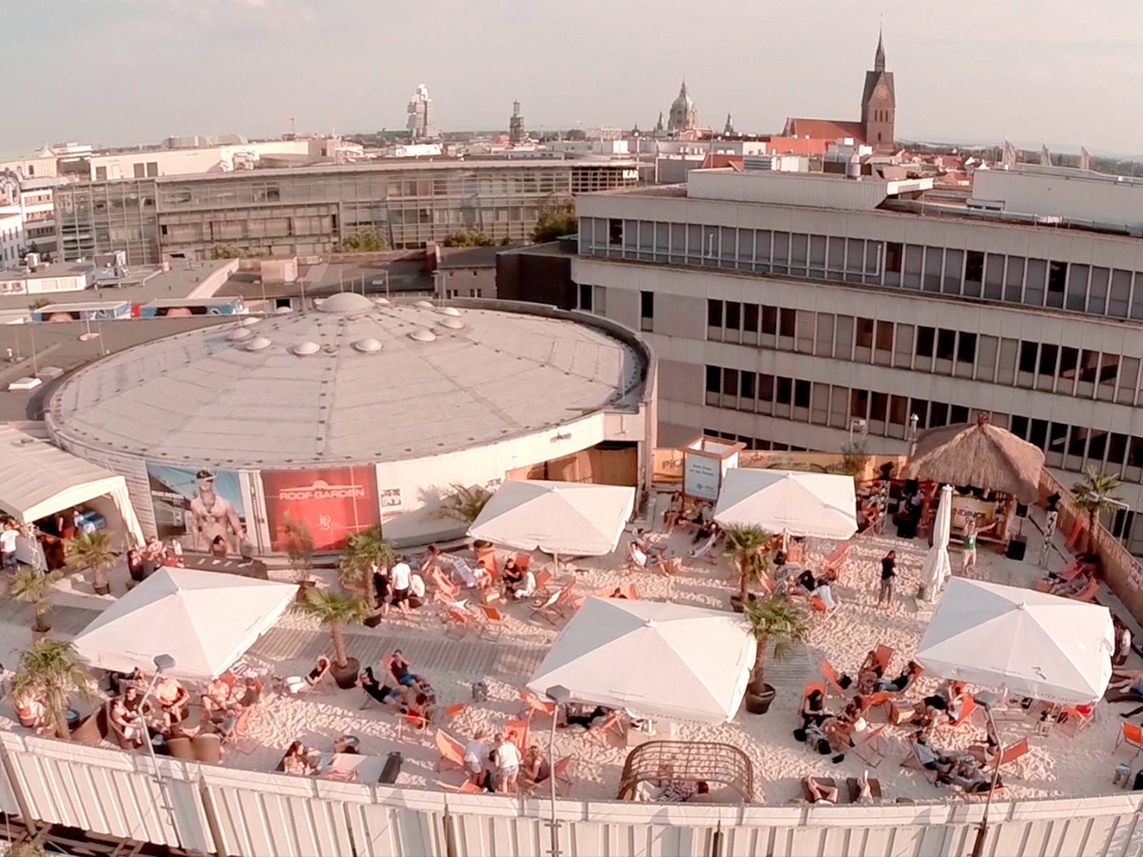 Sommerfeeling pur mit Liegestühlen, feinem Sand und Palmen im Beach-Bereich. Im überdachten Lounge-Bereich kann auch bei bedecktem Wetter relaxt werden. Wechselnde