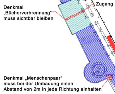 Bei der Bebauung am „Geibel“ werden zukünftig zwei Meter Abstand zu Georg Kolbes „Menschenpaar“ eingehalten. Die Bodenplatte, die an die Bücherverbrennung im Mai 1933 erinnern soll, wird von Bebauung freigehalten und stets zugänglich sein.
