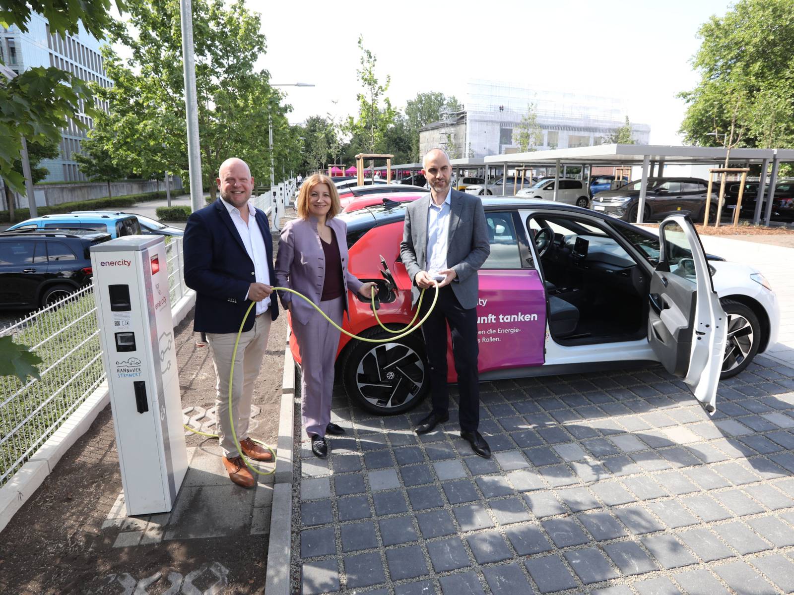 Leif Wiedemann (bauforum), enercity-CEO Dr. Susanna Zapreva und Hannovers Oberbürgermeister Belit Onay eröffnen den enercity-Ladepark.