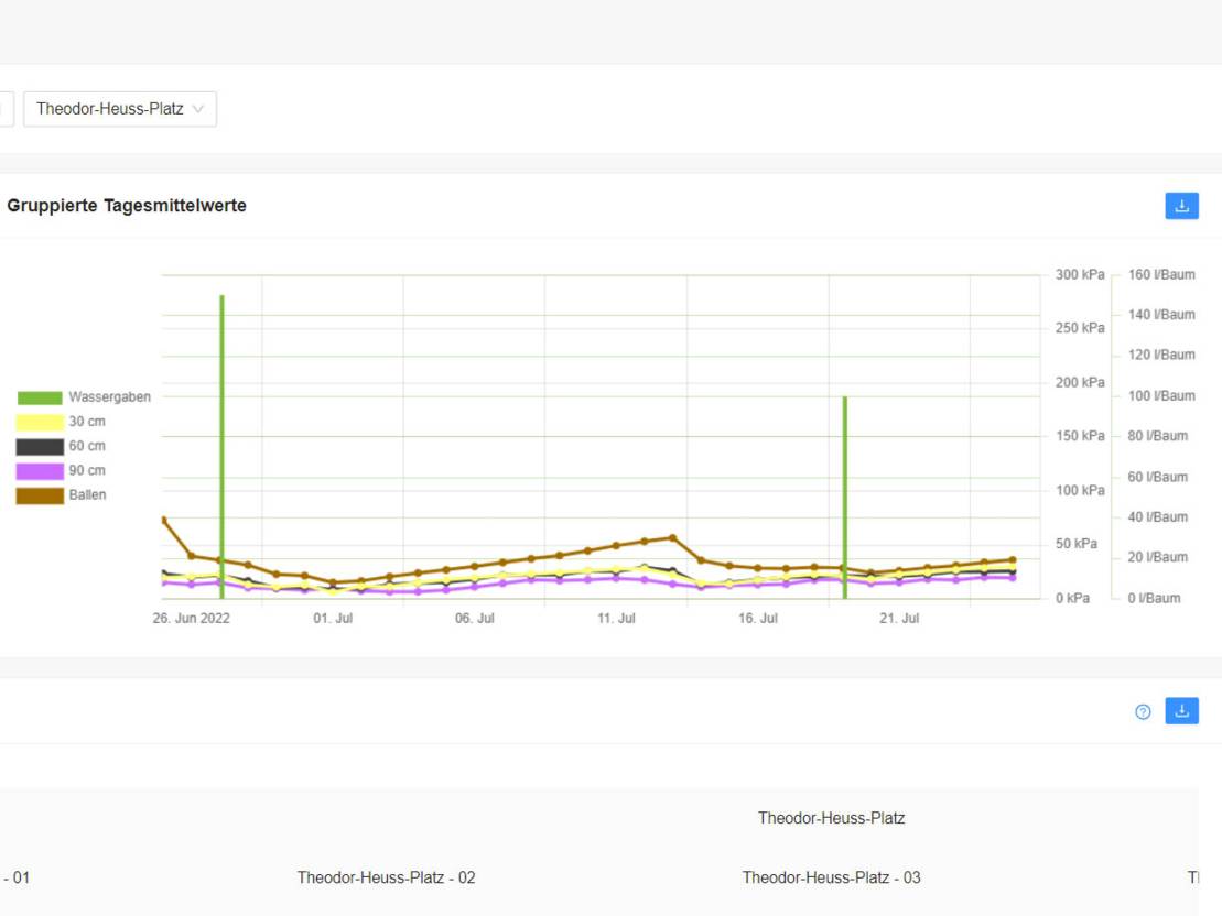 Eine maßgeschneiderte Bewässerung mit digitaler Unterstützung soll hier helfen: Denn Sensoren im Ballen in unterschiedlicher Bodentiefe (in 30, 60 und 90 Zentimeter) ermitteln, ob und wie viel Wasser jeder Baum aktuell braucht und aufnehmen kann. Damit wird zudem sichergestellt, dass auch tiefere Bodenschichten ausreichend durchfeuchtet werden. Dadurch können sich die Bäume zukünftig und auch in trockeneren Perioden besser mit Wasser versorgen. Sie werden langfristig widerstandsfähiger.