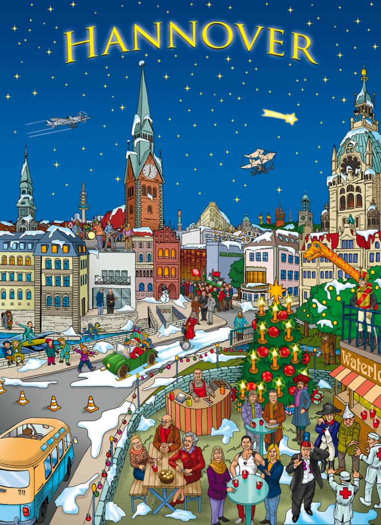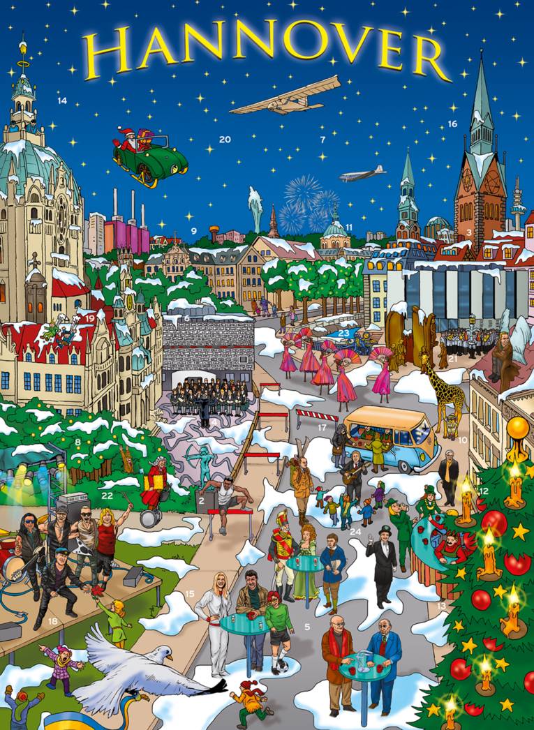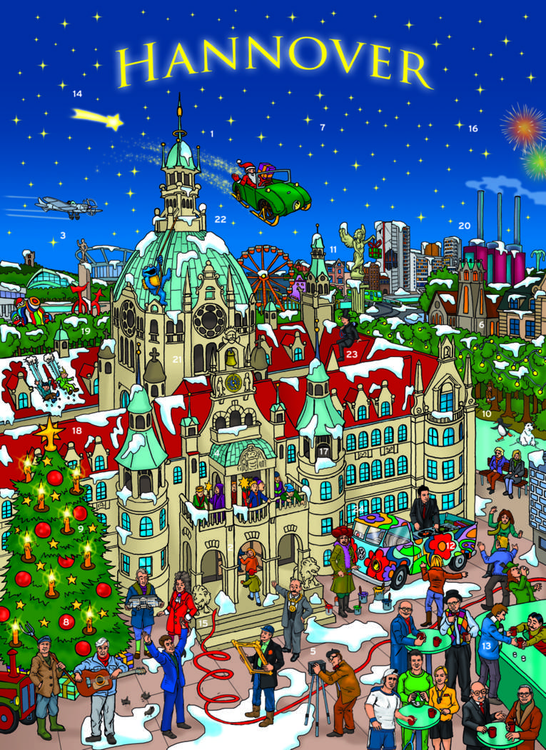 2014: Adventskalender als Wimmelbild mit Persönlichkeiten der Stadt von einst und heute.