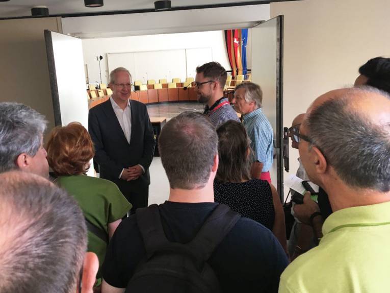 Oberbürgermeister Stefan Schostok bei der Führung durch das Neue Rathaus am Eingang zum Ratssaal