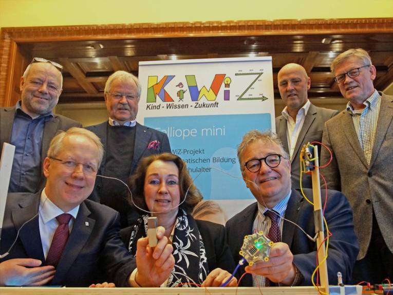 © LHH Am "Heißen Draht" (von links): Dr. Marcus Mey, (Mey ConCePT, Vorstandsmitglied Kind-Wissen-Zukunft e. V.), Oberbürgermeister Stefan Schostok, Sepp D. Heckmann (Vorstandsvorsitzender Kind-Wissen-Zukunft e. V., Katja Meyer-Kobbe (Vorstandsmitglied Kind-Wissen-Zukunft e.V.), Regionspräsident Hauke Jagau, Klaus J. Buß (Geschäftsführer der Calliope gGmbH) und Prof. Dr. Dr. h.c. Axel Haverich (Direktor der Klinik für Thorax-, Herz- und Gefäßchirurgie der Medizinischen Hochschule Hannover / Mitbegründer des Programms "REBIRTH active school"). “
