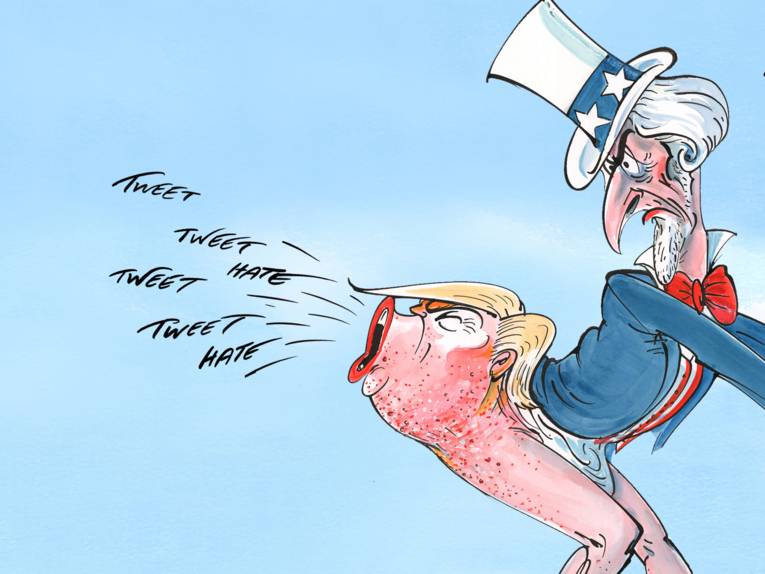 Gerald Scarfe: Trump Uncle Sam backside 4zu3 © Museum Wilhelm Busch – Deutsches Museum für Karikatur und Zeichenkunst Gerald Scarfe: Trump Uncle Sam backside