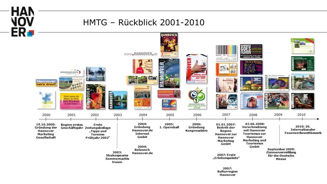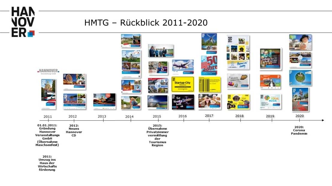 Die 2001 von der Landeshauptstadt und hannoverschen Firmen gemeinsam gegründete Hannover Marketing Gesellschaft (HMG) ist als Public-Private-Partnership konstituiert. Die Landeshauptstadt und Region Hannover (seit dem 01.01.2007) halten je 25% und die hannoverschen Firmen 50% der Gesellschaftsanteile. Im Juni 2008 wurde die Hannover Marketing und Tourismus GmbH (HMTG) gegründet.