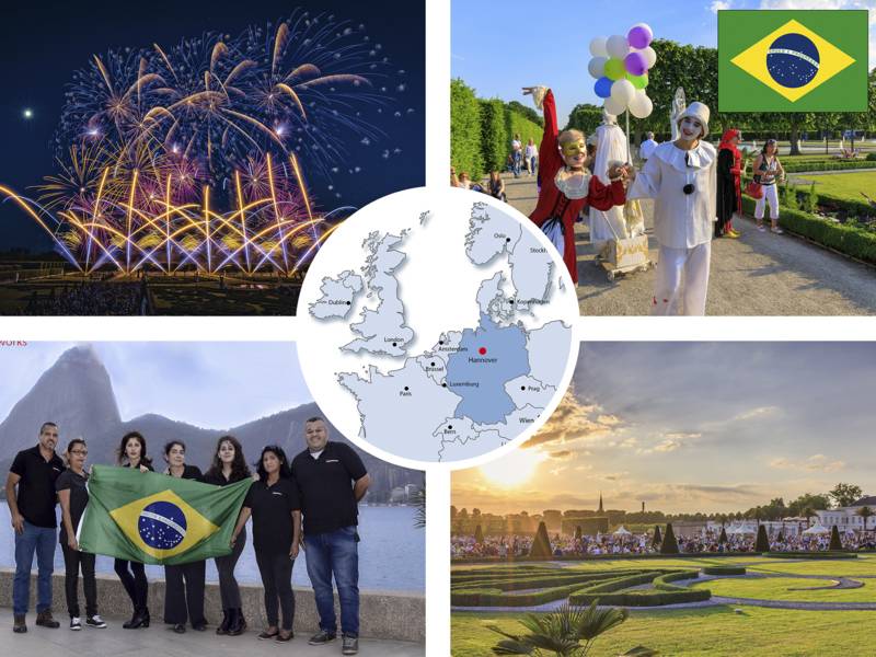 Um 22:30 Uhr übernimmt dann das Team aus Brasilien die Bühne. Für das Team ist die Teilnahme am Internationalen Feuerwerkswettbewerb die Verwirklichung eines Traums und eine große Ehre, ihr Land repräsentieren zu dürfen. Maria Cristina Tiberio, Inhaberin und Designerin für die Show in den Herrenhäuser Gärten: „Es scheint ein Ort, an dem die Zeit stehen geblieben ist, so herrlich, elegant und wunderschön. Ein märchenhafter Ort, um erstaunliche Geschichten mit Feuerwerk zu erzählen.“ Vernunft und Emotion: Duell der Leidenschaften - so lautet das Thema ihrer Show. Der kreative Prozess, der ewige Kontrast zwischen Vernunft und Emotion, das will ihr Feuerwerk zeigen. Von der Herstellung bis zum Design sind Präzision und technisches Wissen erforderlich, das Ziel ist es aber, die Herzen des Publikums zu berühren und unterschiedliche Gefühle zu erzeugen. Es bedarf viel Arbeit für nur wenige Minuten Glanz - für das brasilianische Team eine Metapher des Lebens. Mit einem Soundtrack, der überwiegend aus Instrumental- und Klassikstücken besteht, wird der Zuschauer aufgefordert, die Gelassenheit zu bewahren, während er von abwechslungsreichen Empfindungen getroffen wird, die durch die richtigen Effekte verstärkt werden, wodurch Spannung und Ergriffenheit entstehen und der Rhythmus der Show verändert wird.