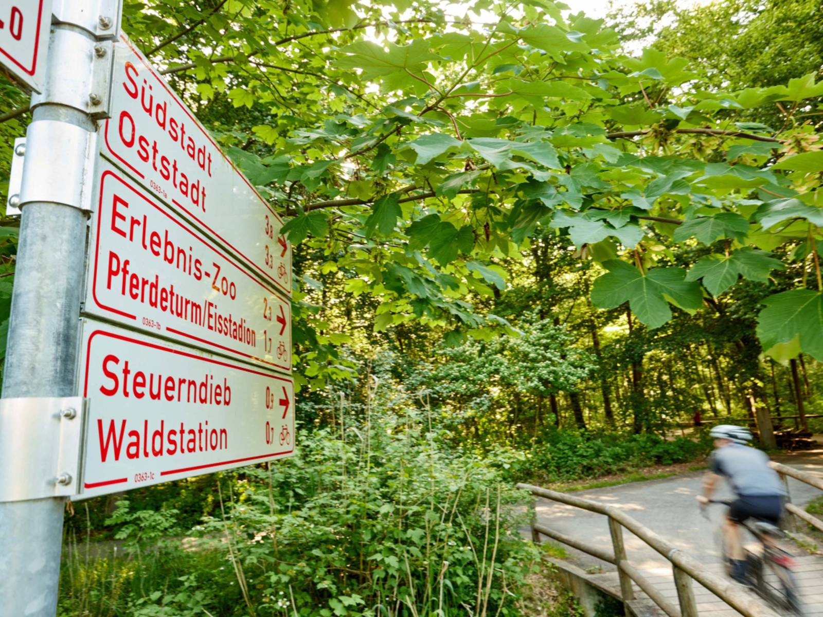 Vom Hauptbahnhof aus führt die 24 Kilometer lange Tour zu ausgesuchten Sehenswürdigkeiten. Sie ergänzt den Roten Faden, der für Fußgänger auf 4,2 Kilometern durch die Innenstadt zu markanten Orten führt. Los geht es an der Tourist-Information (Ernst-August-Platz gegenüber vom Hauptbahnhof), dann durch Hannovers Stadtwald Eilenriede zum Erlebnis-Zoo. Die Route folgt dem Julius-Trip-Ring zum Biergarten Bischofshol (Zeit für eine erste Rast).