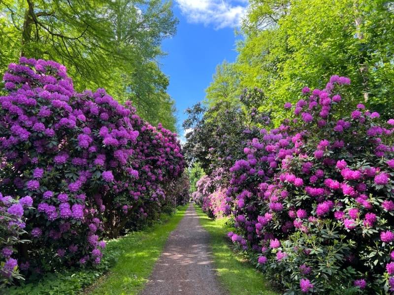 Im waldartigen Schlosspark (dem "Knick") stehen viele alte und einige seltene Bäume. Seit 1913 zieren Rhododendren die etwa 400 m lange Schlossallee. Besonders zur Blütezeit (Ende Mai/Anfang Juni) bietet sich von hier ein malerischer Blick auf das Schloss.
