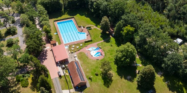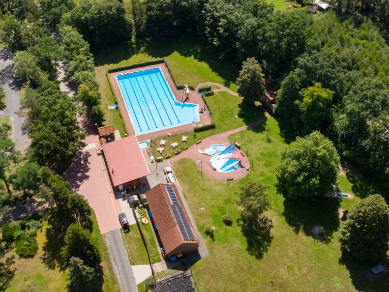 Kinderbecken: drei unterschiedlich große und tiefe Becken, die miteinander verbunden sind, Wasserfontäne, Rutsche. Das Becken wird mit einem Sonnensegel verschattet.